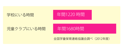 2012年の調査では、こどもが児童クラブで過ごす時間は、学校にいる時間に比べ年間約460時間も多くなっており、果たす役割はますます大きくなっています。